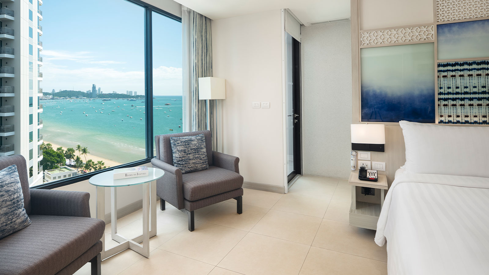 Overlook the view of Pattaya Bay from the Deluxe Ocean View. The elegant guest room features a balcony, work desk and a living area.