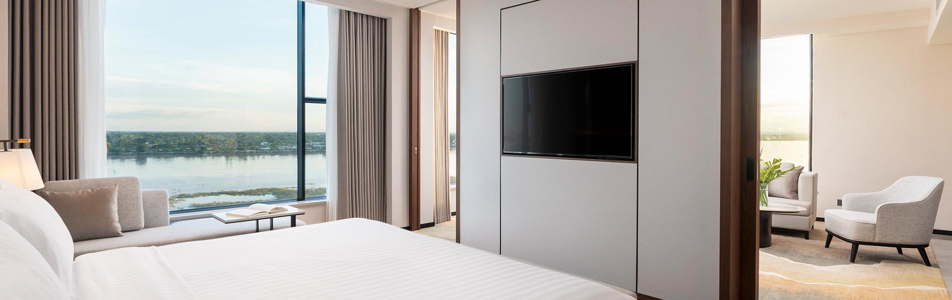 Restful accommodations, city or river views, plush beds. Club Nava lounge privileges for suite guests.